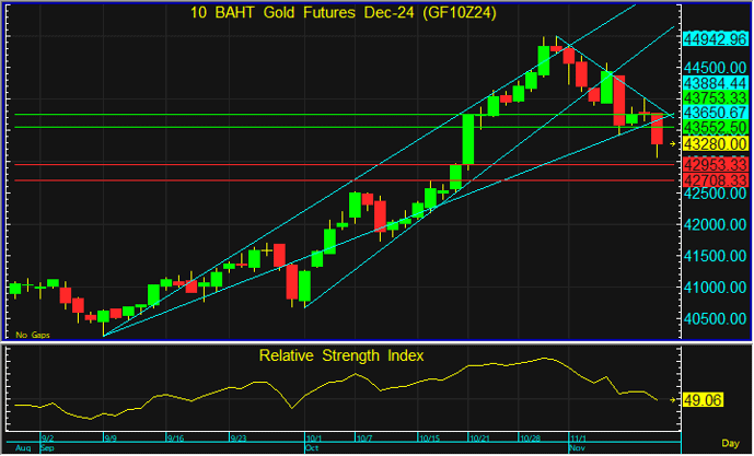 GF10Z24 ถูกกดดันจากการแข็งค่าของสกุลเงินดอลลาร์ รวมทั้งการที่นักลงทุนกังวลว่าชัยชนะในการเลือกตั้งประธานาธิบดีของโดนัลด์ ทรัมป์ อาจส่งผลต่อนโยบายการเงินของ Fed แนะนำรอ Long สัญญา GF10Z24 ที่ 42,950 บาท โดยมีเป้าทำกำไรที่ 43,550 บาท และตัดขาดทุนหากทะลุระดับ 42,700 บาท