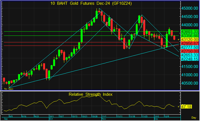 GF10Z24 ปรับตัวลงจากแรงขายทำกำไรหลังจากราคาพุ่งแตะระดับสูงสุดในรอบกว่า 5 สัปดาห์ในวันพฤหัสบดีที่แล้ว และถูกกดดันจากการที่ดอลลาร์สหรัฐแข็งค่าขึ้น แต่ด้วยราคาที่ซื้อขายอยู่บริเวณแนวรับ จึงแนะนำรอเปิด Long สัญญา GF10Z24 ที่ 42,950 บาท โดยมีเป้าทำกำไรที่ 43,350 บาท และตัดขาดทุนหากทะลุระดับ 42,750 บาท