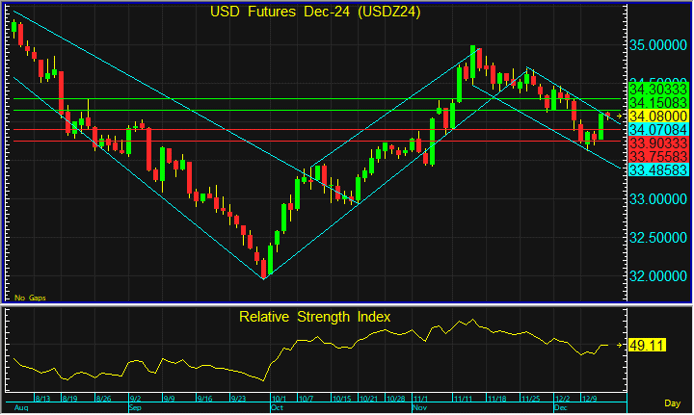 USDZ24 ปรับตัวขึ้นจากแนวโน้มเศรษฐกิจสหรัฐที่ยังคงประกาศตัวเลขเศรษฐกิจออกมาแข็งแกร่ง แม้จะมีประเด็นว่าธนาคารกลางสหรัฐ น่าจะมีการปรับลดดอกเบี้ยในสัปดาห์นี้ แนะนำรอเปิด Short สัญญา USDZ24 ที่ 34.15 บาท โดยมีเป้าทำกำไรที่ 33.90 บาท และตัดขาดทุนหากราคาทะลุระดับ 34.30 บาท