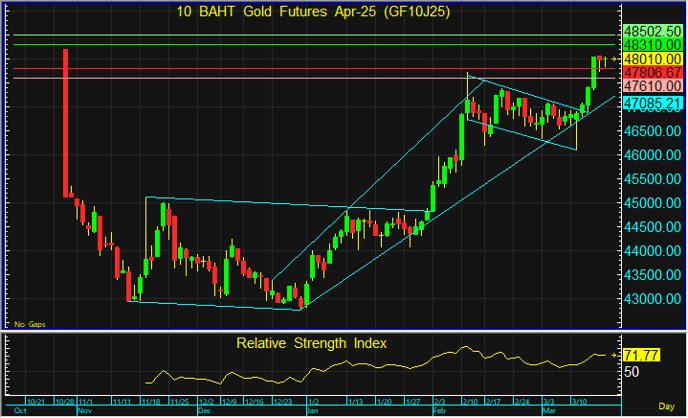 GF10J25 ยังได้แรงหนุนจากประเด็น Trade war โดยในคืนวันพรุ่งนี้จะมีการประกาศดอกเบี้ยจากธนาคารกลางสหรัฐฯ (เฟด) ซึ่งอาจสร้างความผันผวนให้ตลาดเพิ่มเติม โดยกลับมาแนะนำไล่เปิด Long โดยมีเป้าหมายทำกำไรที่ระดับ 48,300 บาท และตัดขาดทุนหากราคาหลุดแนวรับแรกที่ 47,800 บาท