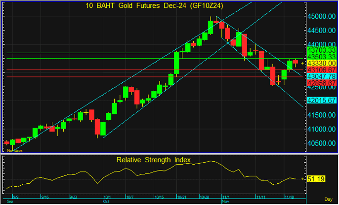 GF10Z24 ปรับตัวขึ้นต่อหลังยูเครนเปิดฉากยิงขีปนาวุธ ATACMS จำนวน 6 ลูกโจมตีแคว้นไบรอันสค์ของรัสเซีย โดยการยิงมีขึ้นหลังจากรัฐบาลของประธานาธิบดีโจ ไบเดน ได้อนุมัติให้สามารถใช้ระบบขีปนาวุธ ATACMS ของสหรัฐฯ โจมตีลึกเข้าไปในดินแดนรัสเซีย แนะนำรอ Short สัญญา GF10Z24 ที่ 43,500 บาท โดยมีเป้าทำกำไรที่ 43,100 บาท และตัดขาดทุนหากทะลุระดับ 43,700 บาท