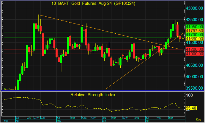 GF10Q24 หลังราคาขึ้นทดสอบต้านสำคัญที่ 42,500 บาท กลับต้องเผชิญกับแรงขายอีกครั้ง แม้จะมีข่าวโจ ไบเดน ขอถอนตัวชิง ปธน.สหรัฐฯ แนะนำรอ Long สัญญา GF10Q24 ที่ 41,200 บาท โดยมีเป้าทำกำไรที่ 41,700 บาท และตัดขาดทุนหากหลุดแนวรับสำคัญที่ 41,000 บาท