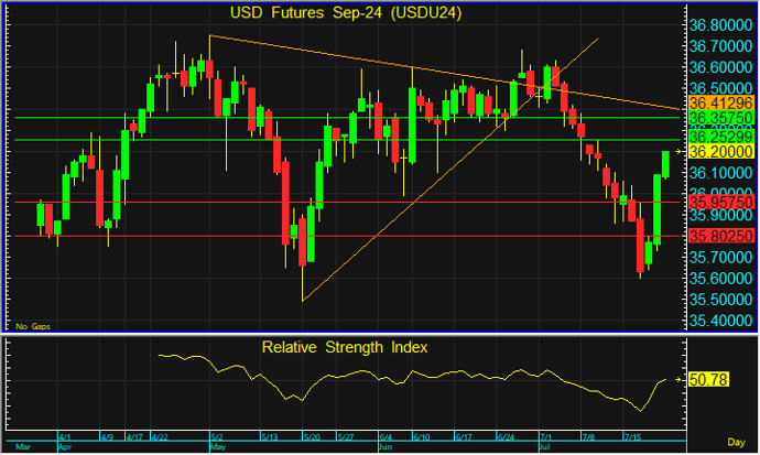 USDU24 ล่าสุดตลาดประเมินว่าในปีนี้ Fed น่าจะมีโอกาสปรับลดดอกเบี้ยได้ 2-3 รอบ ราคาที่เร่งตัวขึ้นมามองว่า Upside เหลือน้อยแล้ว แนะนำรอ Short สัญญา USDU24 ที่ 36.25 บาท โดยมีเป้าทำกำไรที่ 35.95 บาท และตัดขาดทุนหากราคาทะลุแนวต้านที่ 36.35 บาท