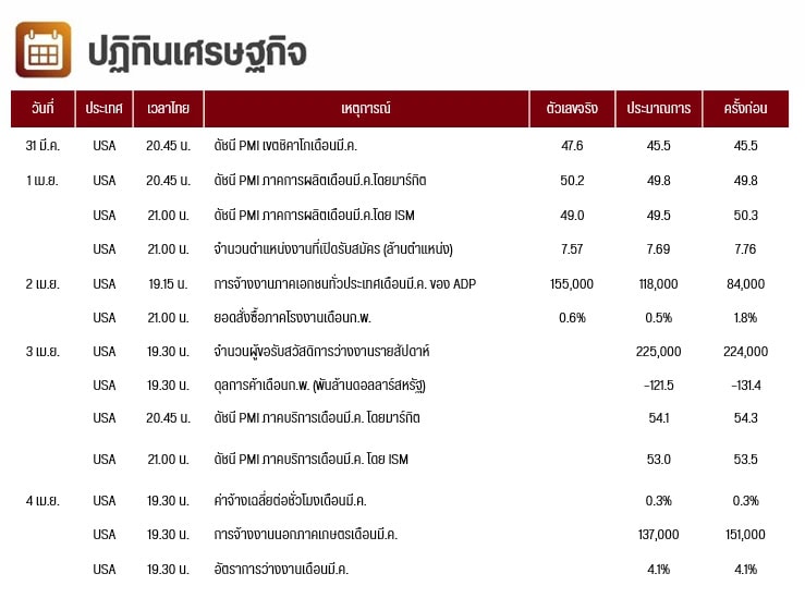 คืนนี้สหรัฐฯ จะเปิดเผยจำนวนผู้ขอรับสวัสดิการว่างงานรายสัปดาห์ ดัชนี PMI ภาคบริการเดือนมี.ค. โดยมาร์กิต และ ดัชนี PMI ภาคการบริการ โดย ISM