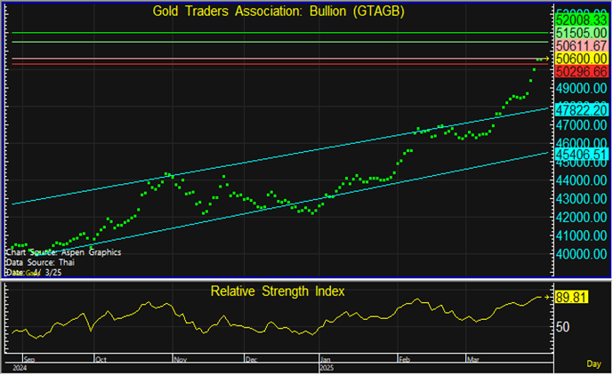 เช้านี้ราคาทองคำในประเทศ ยังได้แรงหนุนจากค่าเงินบาทที่กลับขึ้นมาอ่อนค่า แต่กลับมาแนะนำ Wait and See เพื่อรอดูท่าทีของประเทศต่างๆหลังได้รับผลกระทบทางภาษีก่อน แต่สำหรับนักลงทุนที่ต้องการเก็งกำไรระยะสั้นอาจเสี่ยงไล่ซื้อ โดยมีเป้าทำกำไรที่ระดับ 51,500-52,000 บาท