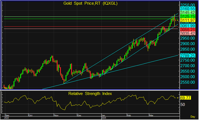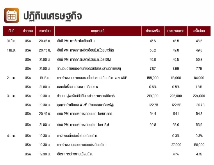 ราคาทอง Spot เมื่อวานเคลื่อนไหวผันผวนมากและปรับลดลงหลุด $3,100 ในช่วงกลางคืน ปิดตลาดลดลง $21 เนื่องจากนักลงทุนเทขายทำกำไร หลังจากปรับขึ้น All-time high แตะ 3,167 ดอลลาร์ ให้ผลตอบแทน 20.7% สงครามการค้าโลกรุนแรงทำให้มีแรงซื้อทองคำกลับเข้ามาและราคาทองกลับมายืนเหนือ $3,100 ได้ ท่ามกลางตลาดหุ้นสหรัฐปรับลงแรงเกือบ 4% ซึ่งทรัมป์ประกาศเมื่อวันที่ 2 เม.ย.ว่าจะเรียกเก็บภาษีนำเข้า 10% สําหรับสินค้านําเข้าทั้งหมด จะมีผลบังคับใช้ในวันที่ 5 เม.ย. และเก็บภาษีศุลกากรตอบโต้จะแตกต่างกันในรายประเทศ จะมีผลบังคับใช้ในวันที่ 9 เม.ย. ส่วนดัชนี PMI ภาคบริการของ ISM เดือนมี.ค. ลดลงเหลือ 50.8 ต่ำกว่าตลาดคาด กองทุน SPDR ซื้อทอง 4.30 ตัน