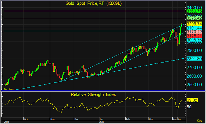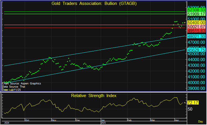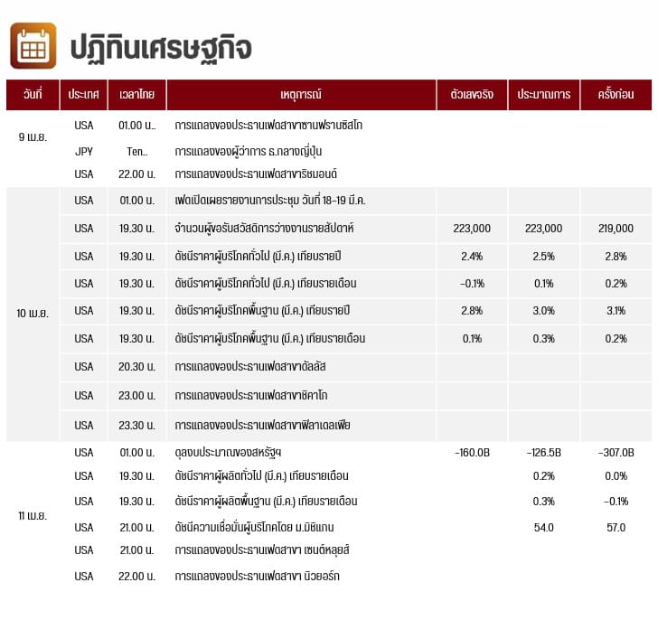 ราคาทอง Spot ปรับขึ้นแรง 93 ดอลลาร์ ทำ All-time high ที่ $3,176 และยังปรับขึ้นทำ All-time high ต่อเนื่อง เนื่องจากมีแรงซื้อทองคำซึ่งเป็นสินทรัพย์ปลอดภัย ท่ามกลางสงครามการค้าระหว่างสหรัฐและจีนรุนแรง รวมทั้งการอ่อนค่าของดอลลาร์ ซึ่งทำเนียบขาว เปิดเผยว่า ขณะนี้สหรัฐเก็บภาษีนำเข้าสินค้าจากจีนในอัตรา 145% หลังจากทรัมป์ประกาศเพิ่มการเก็บภาษีนำเข้าสินค้าจากจีนเป็น 125% แต่อัตราภาษีดังกล่าวยังไม่รวมกับทรัมป์เก็บภาษี 20% เมื่อวันที่ 4 มี.ค. ส่วนเงินเฟ้อ CPI เดือนมี.ค. เพิ่มขึ้น 2.4% เมื่อเทียบรายปี จากระดับ 2.8% ในเดือนก.พ. และต่ำกว่าตลาดคาดที่ระดับ 2.5% การแถลงของผู้ว่าการเฟด 2 ท่าน ระบุว่า ผลกระทบของนโยบายการค้ายังคงไม่แน่นอน ส่งสัญญาณเฟดยังไม่ลดอัตราดอกเบี้ย กองทุน SPDR ซื้อทองสูงต่อเนื่องเป็นวันที่ 2 อีก 12.62 ตัน
