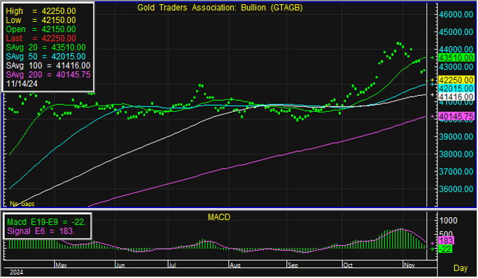 ราคาทองคำปรับลดลงต่อเนื่อง จากแรงกดดันเงินดอลลาร์แข็งค่าสุดในรอบกว่า 1 ปี ซึ่งประธานเฟดส่งสัญญาณไม่รีบลดดอกเบี้ย ขณะที่สหรัฐเปิดเผยจำนวนผู้ขอรับสวัสดิการว่างงานรายสัปดาห์ลดลงเหลือ 217,000 ราย ต่ำสุดในรอบ 6 เดือน ส่วนดัชนีราคาผู้ผลิต (PPI) เดือนต.ค. เพิ่มขึ้น 0.2% เท่ากับตลาดคาด ส่วนกองทุน SPDR ขายทอง 1.15 ตัน