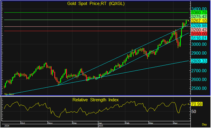 ราคาทอง Spot ปรับขึ้นทำ All-time high ที่ $3,245 เมื่อวันจันทร์ที่ผ่านมา ส่วนเมื่อวานราคาทองเริ่มเคลื่อนไหวในกรอบแคบ เนื่องจากมีแรงซื้อทองคำซึ่งเป็นสินทรัพย์ปลอดภัย ท่ามกลางความไม่แน่นอนเกี่ยวกับมาตรการภาษีนำเข้าของทรัมป์ โดยเมื่อวันศุกร์ที่ผ่านมา (11 เม.ย.) สหรัฐได้ประกาศยกเว้นภาษีสำหรับสมาร์ตโฟน คอมพิวเตอร์ และสินค้าอิเล็กทรอนิกส์บางรายการที่นำเข้าจากจีน อย่างไรก็ดีทรัมป์ กล่าวว่า การยกเว้นภาษีเหล่านี้จะเป็นเพียงชั่วคราวเท่านั้น ส่วนเช้าวันนี้ราคาทองปรับขึ้นทำ All-time high ต่อเนื่อง ท่ามกลางสงครามการค้าระหว่างสหรัฐและจีนรุนแรง กองทุน SPDR ถือทองเท่าเดิมติดต่อกัน 2 วัน หลังจากซื้อทอง 20.35 ตันในสัปดาห์ก่อน