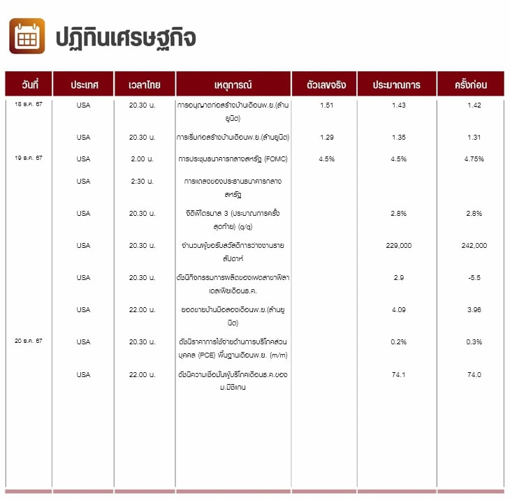คืนนี้สหรัฐฯ จะเปิดเผยจีดีพีไตรมาส 3 (ประมาณการครั้งสุดท้าย) จำนวนผู้ขอรับสวัสดิการว่างงานรายสัปดาห์ ดัชนีกิจกรรมการผลิตของเฟดสาขาฟิลาเดลเฟียเดือนธ.ค และยอดขายบ้านมือสองเดือนพ.ย.