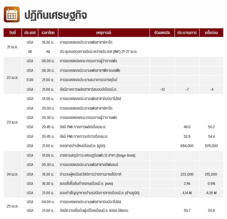 คืนนี้สหรัฐฯ จะมีการประกาศดัชนี PMI ภาคการผลิตและการบริการ ของเดือนเม.ย. และยอดขายบ้านใหม่เดือนมี.ค.