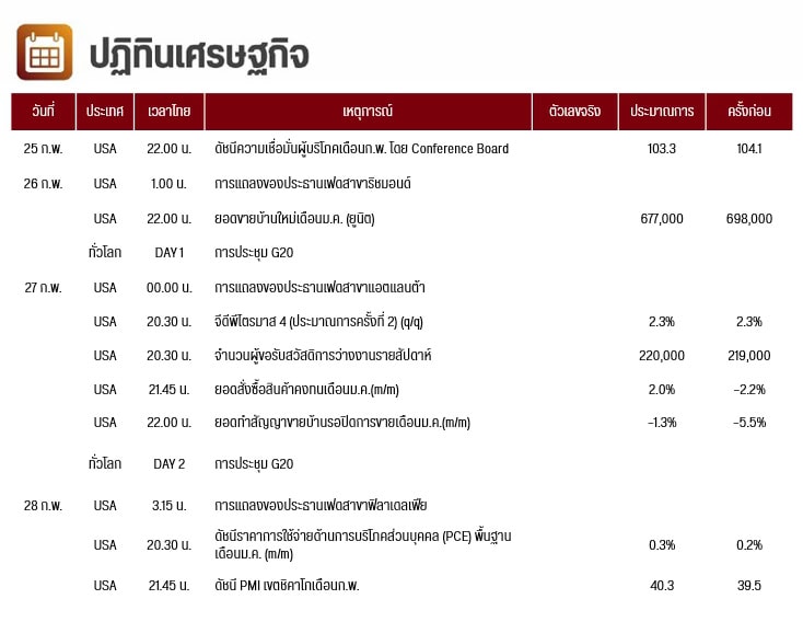 สัปดาห์นี้สหรัฐจะเปิดเผยจีดีพีไตรมาส 4 (ประมาณการครั้งที่ 2) และดัชนีราคาการใช้จ่ายด้านการบริโภคส่วนบุคคล (PCE) พื้นฐานเดือนม.ค. (m/m)