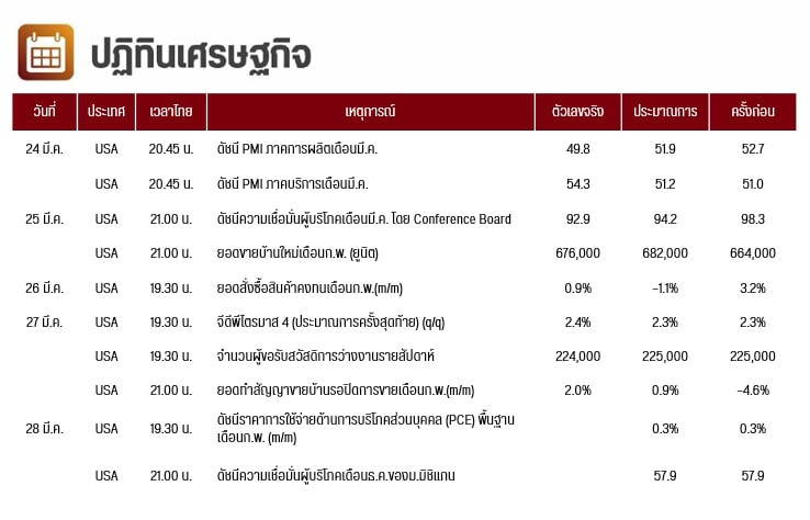 คืนนี้สหรัฐจะเปิดเผยดัชนีราคาการใช้จ่ายด้านการบริโภคส่วนบุคคล (PCE) พื้นฐานเดือนก.พ. ตลาดคาดว่าจะเพิ่มขึ้น 0.3% จากที่เพิ่ม 0.3% ในเดือนม.ค. และดัชนีความเชื่อมั่นผู้บริโภคเดือนธ.ค.ของม.มิชิแกน ตลาดคาดว่าจะทรงตัวที่ระดับ 57.9