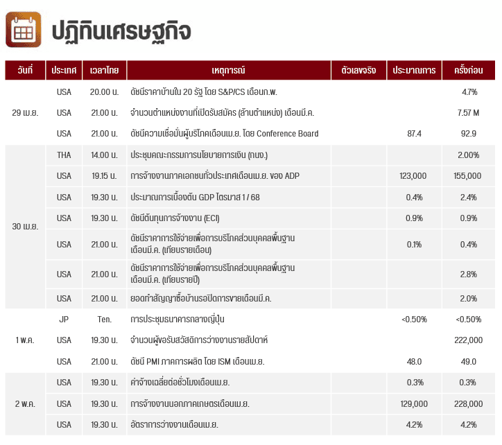 คืนนี้ สหรัฐฯ จะมีการประกาศตัวเลขตำแหน่งงานที่เปิดรับสมัคร (มี.ค.) และดัชนีความเชื่อมั่น (เม.ย.) จาก Conference Board