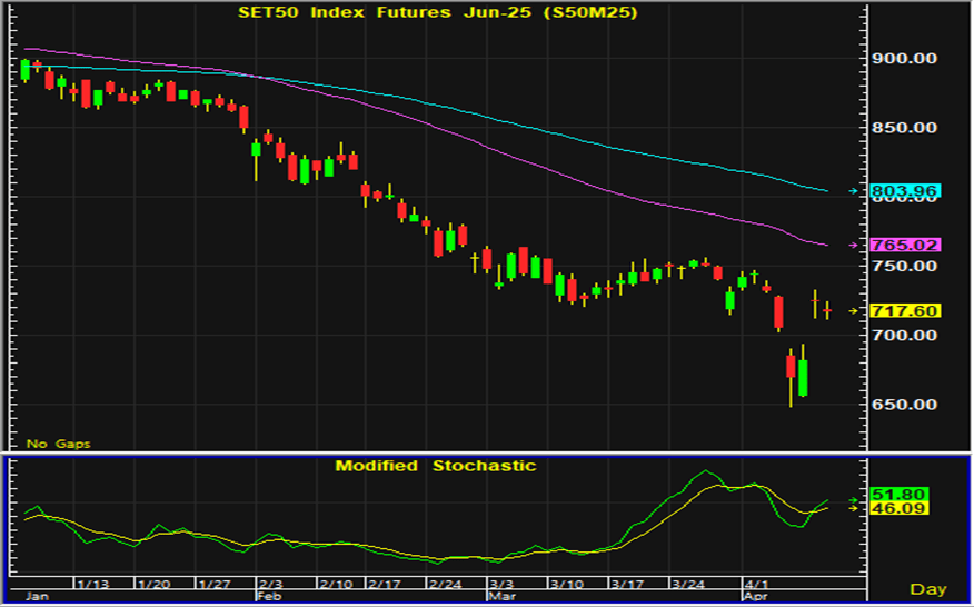 ตลาดหุ้นไทยแกว่งตัวแคบก่อนที่จะปิดตลาดอ่อนตัวลงในการซื้อขายวันศุกร์ที่ผ่านมา แต่เป็นการปิดตลาดเพิ่มขึ้นเป็นสัปดาห์แรกหลังจากปรับตัวลงต่อเนื่อง 2 สัปดาห์ ประเด็นการค้าระหว่างประเทศเป็นประเด็นที่นักลงทุนให้ความสนใจ โดยหลังจากสหรัฐประกาศมาตรการภาษีกีดกันการค้าจากหลายประเทศแต่กลับมีการขยายเวลาในการบังคับใช้ ส่งผลให้แรงกดดันจากประเด็นนี้เริ่มลดลง และในช่วงที่ตลาดการเงินของไทยปิดตลาดการนั้น ตลาดหุ้นของหลายประเทศเริ่มฟื้นตัวหลังนักลงทุนคลายกังวลจากประเด็นดังกล่าว การเคลื่อนไหวของตลาดหุ้นไทยในวันนี้จึงมีแนวโน้มที่จะฟื้นตัวขึ้นเช่นกัน การเก็งกำไรในสัญญาเดือน M แนะนำเปิดสถานะซื้อใกล้แนวรับบริเวณ 712-713 จุด และมีจุดขายตัดขาดทุนอยู่ที่ 710 จุด โดยมีแนวต้านสำหรับเปิดสถานะขายอยู่ที่บริเวณ 733-734 จุด และมีจุดปิดสถานะตัดขาดทุนอยู่ที่ 736 จุด