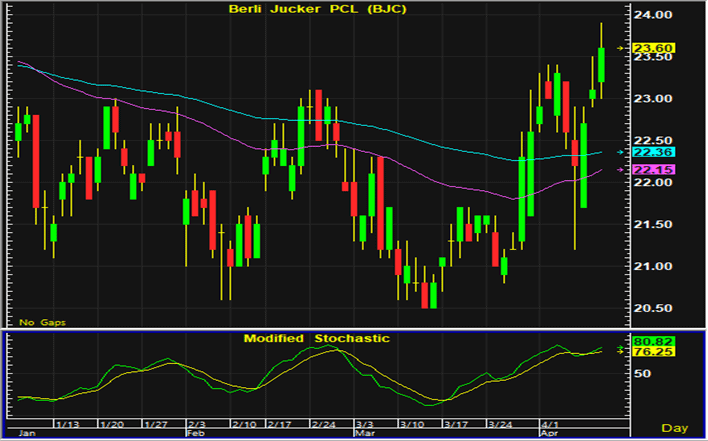 ราคาหุ้น BJC ปิดตลาดเหนือแนวต้านซึ่งเป็นจุดสูงสุดของเดือน การเคลื่อนไหวทางเทคนิคจึงกลับมาเคลื่อนไหวในทิศทางฟื้นตัว หากยังสามารถประคองตัวเหนือแนวรับ 23.3-23.4 บาท แนะนำเปิดสถานะซื้อ และมีจุดขายตัดขาดทุนอยู่ที่ 23 บาท