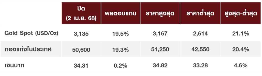 ในต้นเดือนเมษายนราคาทองคำ Spot ปรับตัวขึ้นทำ All-time high ติดต่อกันทุกวัน ในช่วงเช้าของวันนี้ราคาทองคำ Spot ยังปรับตัวขึ้นทำ All-time high นับเป็นครั้งที่ 21 ของปีนี้ แตะ 3,167 ดอลลาร์ ให้ผลตอบแทน 20.7% ราคาทองแท่งไทยปรับตัวขึ้นทำ All-time high อย่างต่อเนื่องเช่นกัน นับเป็นครั้งที่ 20 ของปีนี้ แตะ 51,250 บาท ให้ผลตอบแทน 20.9% ได้รับผลบวกจากเงินบาทที่อ่อนค่าลงมากในเดือนนี้ เนื่องจากไทยเป็นประเทศที่สหรัฐขาดดุลการค้ามากที่สุดเป็นอันดับที่ 10 และเก็บภาษีศุลกากรตอบโต้กับไทยในอัตรา 36%