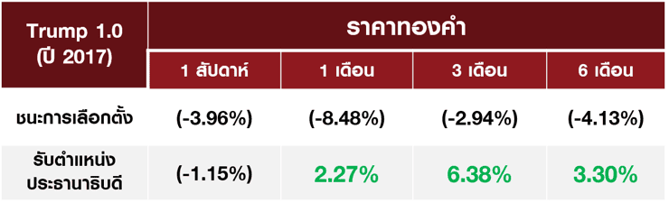 ราคาทองคำมักปรับตัวลง ภายหลังที่ทรัมป์ชนะการเลือกตั้ง อย่างไรก็ตาม มีความน่าสนใจตรงที่ภายหลังที่ทรัมป์ได้มีการเข้ารับตำแหน่งประธานาธิบดีสหรัฐฯ อย่างเป็นทางการนั้น ภายหลัง 1-6 เดือน ราคาทองคำจะปรับตัวสูงขึ้น โดยราคาทองคำปรับตัวขึ้นกว่า 6.38% ภายหลัง 3 เดือนที่ทรัมป์เข้ารับตำแหน่งประธานาธิบดีสหรัฐฯ และปรับตัวขึ้นกว่า 3.30% ภายหลัง 6 เดือนที่ทรัมป์เข้ารับตำแหน่งประธานาธิบดีสหรัฐฯ