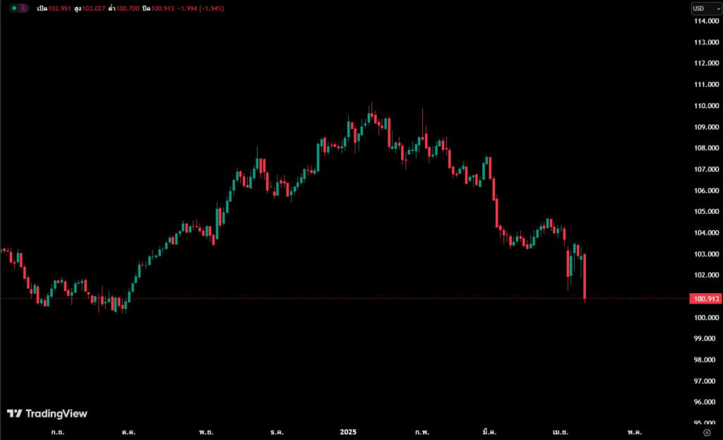 ทั้งนี้ ดัชนีดอลลาร์ซึ่งเป็นดัชนีวัดความเคลื่อนไหวของดอลลาร์เมื่อเทียบกับสกุลเงินหลัก 6 สกุลในตะกร้าเงิน ร่วงลง 1.99% แตะที่ระดับ 100.866