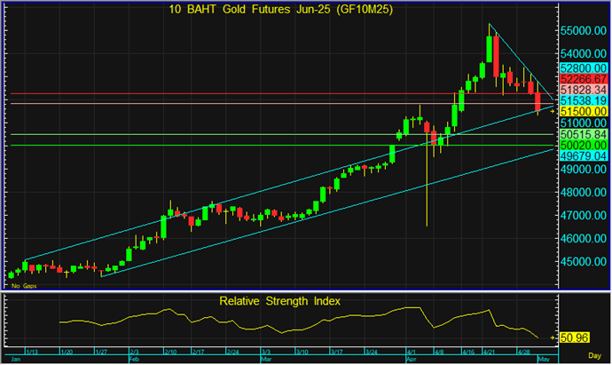 GF10M25 ที่ย่อตัวลงมาในช่วงเช้า ประเมินว่ายังเหลือ Downside อยู่อีกพอสมควร จึงยังคงแนะนำไล่เปิด Short โดยมีเป้าหมายทำกำไรที่ระดับ 50,500 บาท และตัดขาดทุนหากราคาทะลุแนวต้านแรกที่ระดับ 51,800 บาทขึ้นไป