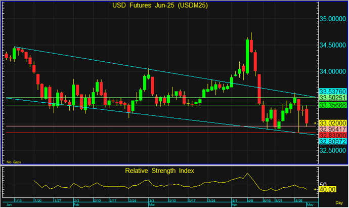 USDM25 ประเมินว่าอาจยังเคลื่อนตัวในกรอบเดิมที่ 32.95-33.35 บาท แต่ด้วยราคาที่ลงมาทดสอบแนวรับแล้วในช่วงบ่าย จึงกลับมาแนะนำรอเปิด Long จากแนวรับที่ 32.95 บาท โดยมีเป้าหมายทำกำไรที่ระดับ 33.35 บาท และตัดขาดทุนหากราคาทะลุแนวรับที่ 32.83 บาทลงไป