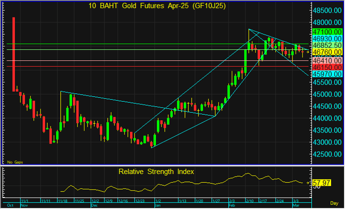 GF10J25 ถูกกดดันจากเส้นแนวโน้มด้านบน ราคาจึงค่อยๆย่อตัวลงจากแนวต้านดังกล่าว จึงแนะนำรอเปิด Short บริเวณแนวต้านที่ระดับ 46,850 บาท โดยมีเป้าหมายทำกำไรที่ระดับ 46,400 บาท และตัดขาดทุนหากทะลุแนวต้านที่ 47,100 บาทขึ้นไป