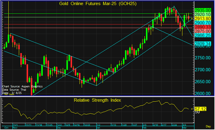 แม้แนวโน้ม GOH25 อาจยังไม่ชัดเจนนัก แต่ด้วยราคาที่ยังไม่สามารถทะลุแนวต้านขึ้นไป ประเมินว่าราคามีโอกาสย่อตัวลง จึงแนะนำรอเปิด Short ที่ระดับ 2,920 ดอลลาร์ โดยมีเป้าทำกำไรที่ระดับ 2,890 ดอลลาร์ และตัดขาดทุนหากทะลุ 2,935 ดอลลาร์ขึ้นไป