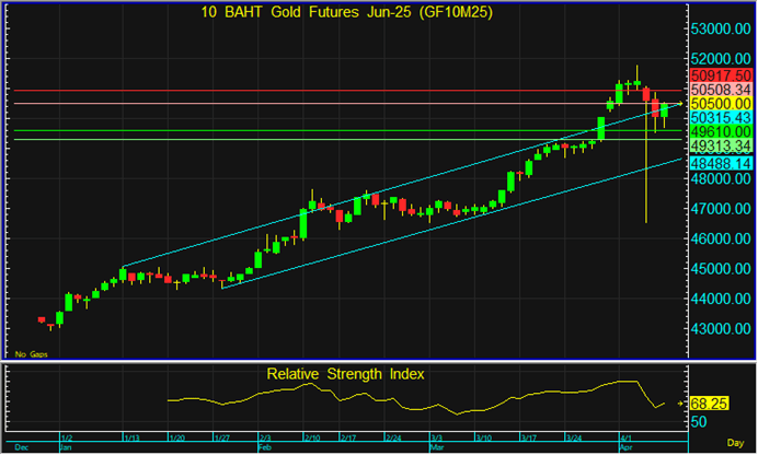 GF10M25 ที่ฟื้นตัวขึ้นจากแนวรับ อาจยังติดแนวต้านสำคัญที่ระดับ 50,500 บาท จึงแนะนำรอเปิด Short จากแนวต้านดังกล่าว โดยมีเป้าหมายทำกำไรที่ 49,600 บาท และตัดขาดทุนหากราคาทะลุแนวต้านที่ 50,900 บาทขึ้นไป