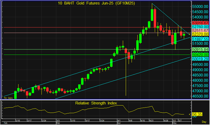 GF10M25 ที่เริ่มย่อตัวลงมา ประเมินว่ายังเหลือ Downside อีกพอสมควร จึงกลับมาแนะนำรอเปิด Short ที่ระดับ 52,500 บาท โดยมีเป้าหมายทำกำไรที่ระดับ 50,400-50,900 บาท และตัดขาดทุนหากราคาทะลุแนวต้านที่ระดับ 53,000 บาทขึ้นไป