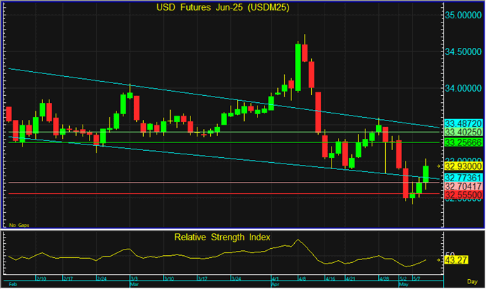USDM25 ประเมินว่าราคาอาจแกว่งตัวในกรอบ 32.70-33.25 บาท จึงแนะนำซื้อขายในกรอบดังกล่าว หากราคาขึ้นทดสอบกรอบบนแนะนำเปิด Short และหากราคาลงทดสอบกรอบล่างแนะนำเปิด Long