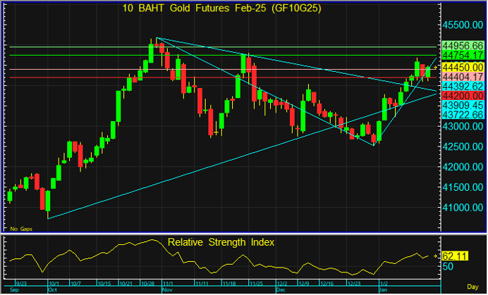 GF10G25 ที่ฟื้นตัวขึ้นมา ประเมินว่ายังมีโอกาสขึ้นต่อได้อีก แต่ในระยะสั้นอาจมีการพักตัวก่อนที่จะสามารถปรับตัวขึ้นต่อได้อีกครั้ง จึงยังแนะนำใช้กลยุทธ์เชิงรับในการรอเปิด Long สัญญา GF10G25 ที่ 44,400 บาท โดยมีเป้าทำกำไรที่ 44,750 บาท และตัดขาดทุนหากทะลุระดับ 44,200 บาท