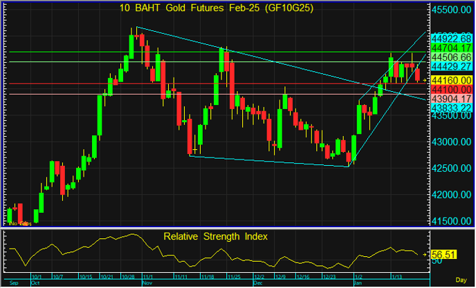GF10G25 ที่ปรับตัวลงมา ประเมินว่ามีโอกาสฟื้นตัวขึ้นจากแนวรับดังกล่าว ซึ่งครั้งก่อนหน้าที่ราคาลงทดสอบก็สามารถฟื้นตัวกลับขึ้นไปได้ จึงแนะนำใช้กลยุทธ์เชิงรับรอเปิด Long สัญญา GF10G25 ที่ 44,100 บาท โดยมีเป้าทำกำไรที่ 44,500 บาท และตัดขาดทุนหากทะลุระดับ 43,900 บาท