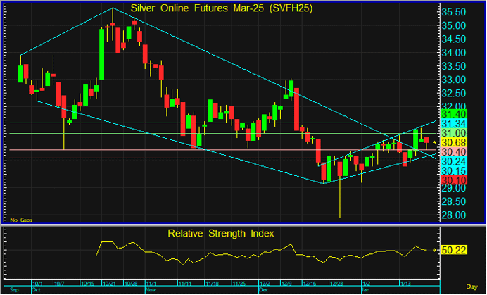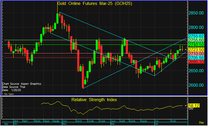 GOH25 เกิดรูปแบบดาวตก (Shooting Stars) ซึ่งราคามักกลับตัวลง แนะนำใช้กลยุทธ์เชิงรับรอเปิด Long สัญญา GOH25 ที่ 2,710 ดอลลาร์ โดยมีเป้าทำกำไรที่ 2,740 ดอลลาร์ และตัดขาดทุนหากราคาทะลุ 2,695 ดอลลาร์