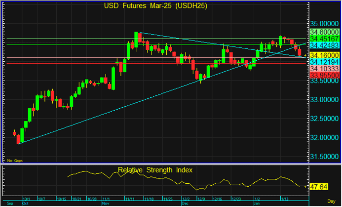 USDH25 ปรับตัวลงจากแนวโน้มที่ ธนาคารกลางสหรัฐฯ อาจกลับมาทบทวนการปรับลดดอกเบี้ยในปีนี้อีกครั้ง แต่ด้วยราคาที่เริ่มปรับตัวลงมาแล้ว จึงแนะนำใช้กลยุทธ์เชิงรับในการรอเปิด Long สัญญา USDH25 ที่ 34.10 บาท โดยมีเป้าทำกำไรที่ 34.45 บาท และตัดขาดทุนหากราคาทะลุระดับ 33.95 บาท