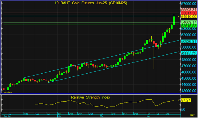 GF10M25 ที่เร่งตัวขึ้นในภาคเช้า อาจต้องเผชิญกับแรงขาย หลังราคาทองโลกขึ้นแตะระดับ 3,500 ดอลลาร์ ซึ่งเป็นแนวต้านทางจิตวิทยา แล้วยังไม่สามารถผ่านขึ้นไปได้ จึงกลับมาแนะนำรอเปิด Short จากแนวต้านที่ระดับ 55,000 บาท โดยมีเป้าหมายทำกำไรที่ 54,000 บาท และตัดขาดทุนหากราคาทะลุแนวต้านที่ระดับ 55,500 บาทขึ้นไป