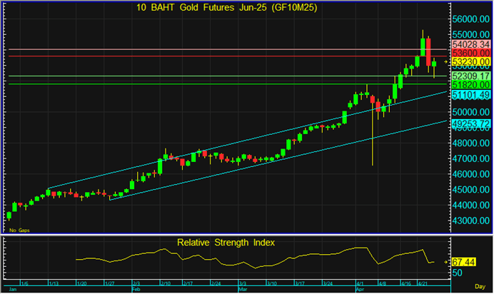 GF10M25 ที่ฟื้นจากแนวรับขึ้นมาในช่วงเช้า อาจยังติดแนวต้าน และย่อตัวลงอีกครั้ง จึงแนะนำไล่เปิด Short โดยมีเป้าหมายทำกำไรที่ 51,800-52,300 บาท และตัดขาดทุนหากราคาทะลุแนวต้านแรกที่ระดับ 53,600 บาทขึ้นไป