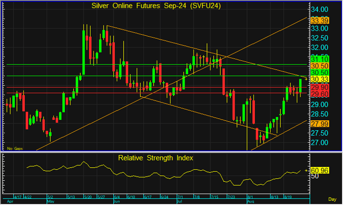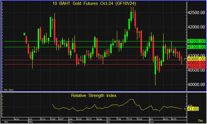 GF10V24 ถูกกดดันด้วยค่าเงินบาท แม้ราคาทองโลกจะเริ่มฟื้นตัวกลับขึ้นมาแล้วก็ตาม แต่ประเมินว่าค่าเงินบาทไม่น่าจะแข็งไปมากกว่านี้เท่าไหร่ หาก Fed ยังไม่ได้เริ่มปรับลดดอกเบี้ยลง แนะนำรอ Long สัญญา GF10Q24 ที่ 40,850 บาท โดยมีเป้าทำกำไรที่ 41,300 บาท และตัดขาดทุนหากทะลุแนวรับที่ 40,700 บาท