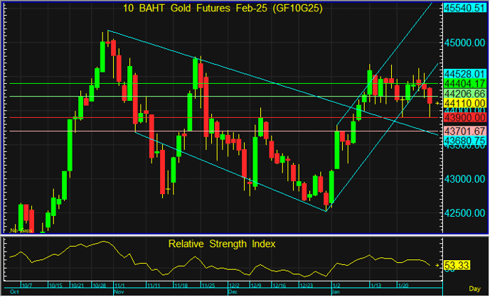 GF10G25 ได้แรงหนุนจากค่าเงินบาทที่อ่อนค่า สวนทางกับราคาทองโลกที่ปรับตัวลง แต่ยังคงแนะนำใช้กลยุทธ์เชิงรับ ในการรอเปิด Long สัญญา GF10G25 ที่ 43,900 บาท โดยมีเป้าทำกำไรที่ 44,200 บาท และตัดขาดทุนหากทะลุระดับ 43,700 บาท