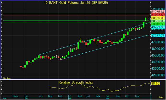 GF10M25 ยังคงได้แรงซื้อ จากสถานการณ์สงครามการค้า ซึ่ง ทรัมป์ จะเริ่มใช้มาตรการทางด้านภาษีหลายรายการในวันที่ 2 เม.ย. ซึ่งต้องรอดูความชัดเจนในวันดังกล่าวอีกครั้ง แต่กลับมาแนะนำไล่ Long โดยมีเป้าหมายทำกำไรที่ 51,000 บาท และตัดขาดทุนหากราคาหลุดแนวรับแรกที่ระดับ 50,300 บาท