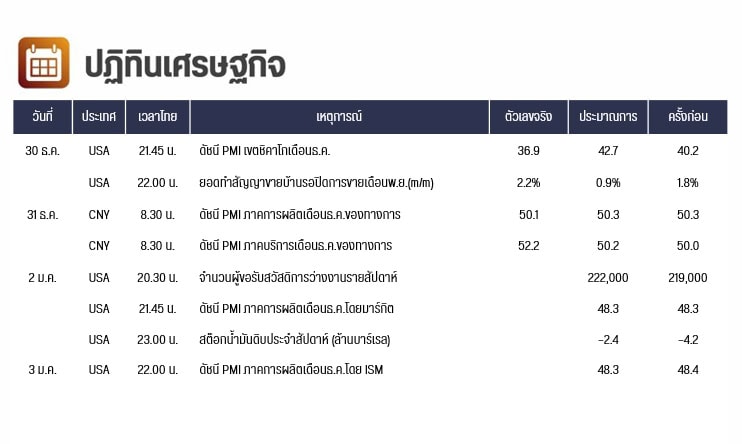 คืนนี้สหรัฐฯ จะเปิดเผยจำนวนผู้ขอรับสวัสดิการว่างงานรายสัปดาห์ ตลาดคาดว่าจะเพิ่มขึ้น 3,000 รายสู่ระดับ 222,000 ราย และดัชนี PMI ภาคการผลิตเดือนธ.ค.โดยมาร์กิต ตลาดคาดว่าจะทรงตัวที่ 48.3