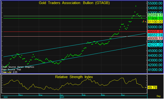 ทองคำในประเทศเผชิญแรงขาย จนหลุดแนวรับสำคัญที่ระดับ 51,800 บาทลงมา แนวโน้มจึงอาจกลับสู่ขาลงอีกครั้ง แนะนำใช้กลยุทธ์เชิงรับรอเข้าซื้อสะสมที่บริเวณระดับ 48,000-49,000 บาท ผู้ที่ต้องการเก็งกำไรในระยะสั้น อาจต้องใช้ความระมัดระวังในการเข้าเก็งกำไร