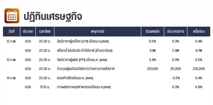 คืนนี้สหรัฐจะเปิดเผยยอดค้าปลีกเดือนม.ค. ตลาดคาดว่าจะลดลง 0.2% จากที่เพิ่มขึ้น 0.4% ในเดือนธ.ค. และการผลิตภาคอุตสาหกรรมเดือนม.ค. ตลาดคาดว่าจะเพิ่มขึ้น 0.3% จากที่เพิ่มขึ้น 0.9% ในเดือนธ.ค.