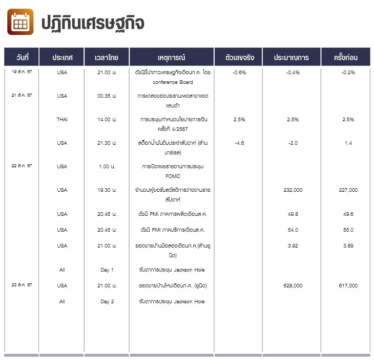 คืนนี้สหรัฐจะเปิดเผยจำนวนผู้ขอรับสวัสดิการว่างงานรายสัปดาห์ ตลาดคาดว่าจะเพิ่มขึ้น 5,000 รายสู่ระดับ 232,000 ราย ดัชนี PMI ภาคการผลิตและภาคบริการเดือนส.ค. ตลาดคาดว่าจะลดลงสู่ระดับ 49.5 และ 54.0 ตามลำดับ และยอดขายบ้านมือสองเดือนก.ค. ตลาดคาดว่าจะเพิ่มขึ้นสู่ 3.93 ล้านยูนิตจาก 3.89 ล้านยูนิตในเดือนมิ.ย.