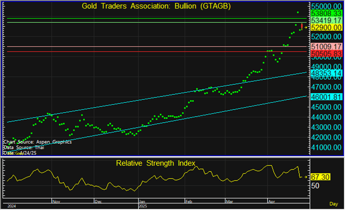 ทองคำในประเทศอาจถูกกดดันจากทองโลกซึ่งประเมินว่าอาจย่อตัวลง ขณะที่ค่าเงินบาทอาจกดดันราคาทองในประเทศให้ลงแรงกว่าราคาทองโลก จึงแนะนำใช้ความระมัดระวังในการเข้าซื้อสะสม โดยหากราคาย่อตัวลงจริง อาจมีการฟื้นตัวกลับจากแนวรับสำคัญที่ 50,500-51,000 บาท