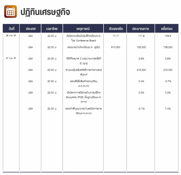 คืนนี้สหรัฐฯ จะเปิดเผยจีดีพีไตรมาส 3 (ประมาณการครั้งที่ 2) จำนวนผู้ขอรับสวัสดิการว่างงานรายสัปดาห์ ยอดสั่งซื้อสินค้าคงทนเดือนต.ค. ดัชนีราคาการใช้จ่ายด้านการบริโภคส่วนบุคคล (PCE) พื้นฐานเดือนต.ค. และยอดทำสัญญาขายบ้านรอปิดการขายเดือนต.ค.