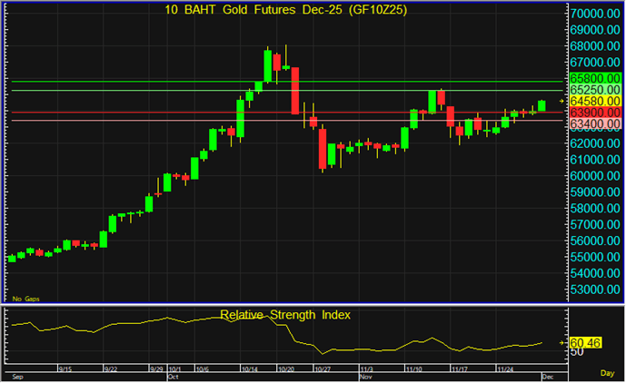 ราคา GF10Z25 อาจยังมีแนวโน้มฟื้นตัวขึ้นต่อ แม้จะมีแนวต้านสำคัญที่ระดับ 65,250 บาท จึงกลับมาแนะนำ Wait and See รอดูแนวโน้มการเคลื่อนตัวในช่วงต้นสัปดาห์นี้ก่อน
