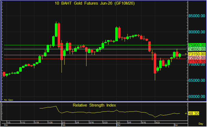 GF10J26 อาจเคลื่อนตัวในกรอบแคบๆ เนื่องจากราคาทองโลกปิดในช่วงเทศกาล Good Friday แนะนำทยอยเปิด Long จากระดับ 72,850 บาท โดยมีเป้าหมายทำกำไรที่ระดับ 74,650 บาท และตัดขาดทุนหากราคาทะลุระดับ 71,700 บาทลงไป