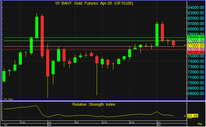 GF10J26 แนะนำรอเปิด Long จากระดับ 76,750 บาท โดยมีเป้าหมายทำกำไรที่ระดับ 77,800 บาท และตัดขาดทุนหากราคาทะลุระดับ 76,200 บาทลงไป
