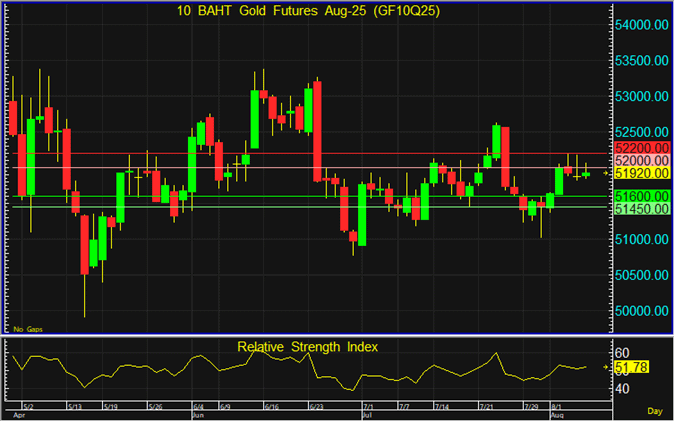 GF10Q25 เริ่มย่อตัวลง หลังราคาขึ้นทดสอบแนวต้านสำคัญที่ระดับ 52,000 บาท จึงแนะนำรอเปิด Short จากแนวต้านดังกล่าว โดยมีเป้าหมายทำกำไรที่ระดับ 51,600 บาท และตัดขาดทุนหากราคาทะลุแนวต้านที่ระดับ 52,200 บาทขึ้นไป