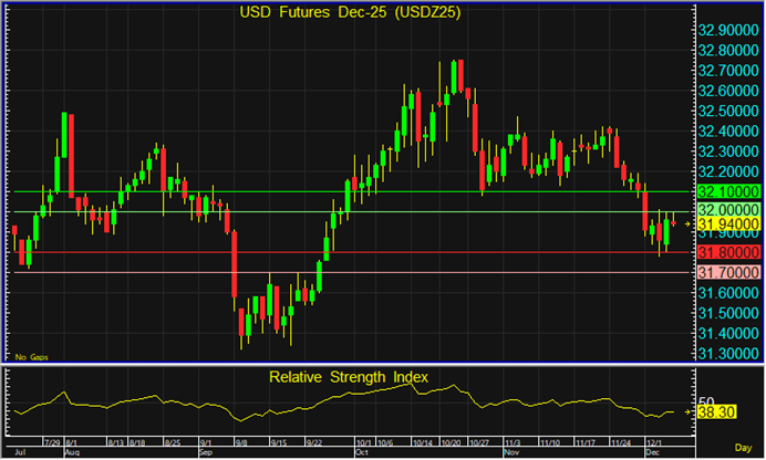 ราคา USDZ25 ขึ้นทดสอบแนวรับ แต่ประเมินว่าราคายังอาจเคลื่อนตัวในกรอบ 31.80-32.00 บาท จึงแนะนำเปิด Short หากราคาขึ้นทดสอบกรอบบนที่ระดับ 32.00 บาท และเปิด Long หากราคาลงทดสอบแนวรับที่ระดับ 31.80 บาท